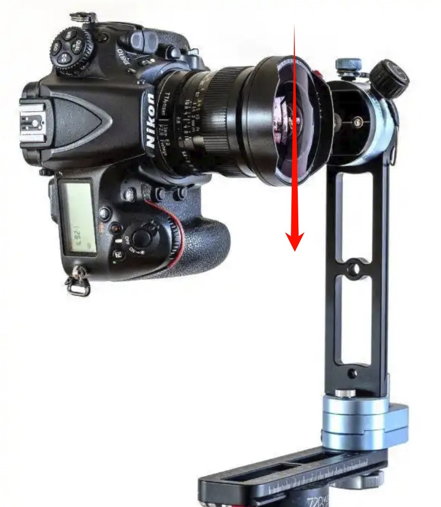 在我们进行泰州VR全景拍摄的过程中,除了部分要求不高的使用VR全景相机外,泰州专业的都是用专业相机,我们在使用专业相机的时候,必不可少的就是VR云台,在长时期用过VR云台的人我想都会遇到一个相当无语的问题:拍摄过程中会出现相像镜头向正下文下垂,如下图箭头方向下垂。
